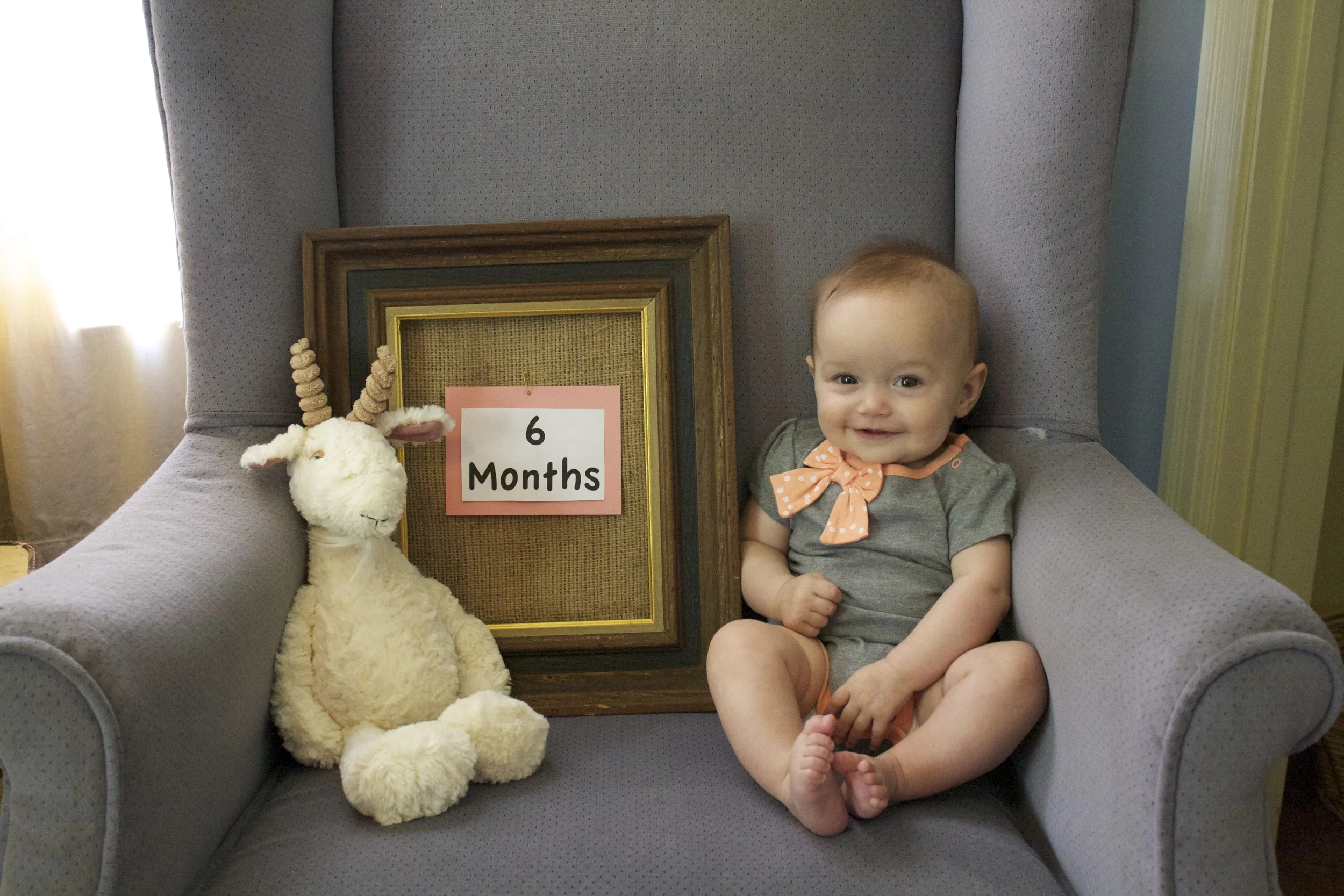 At this age, Gwen is eating more baby food and likes carrots, peas and squash best. She is not a fan of bananas, it's the texture we think. She is also enjoying pears. We have made also some of our own baby food (sweet potato and broccoli). She is jumping in a boucer/jumparoo contraption which gives Mom and Dad a hands-free break to make dinner/go to the bathroom! She is doing fine at daycare, loves sitting up to watch all the other kids and enjoys outside time in the stroller. She is sitting up more on her own and reaching for her toys. We are working on getting her legs stronger to stand up more. She sure is cute!